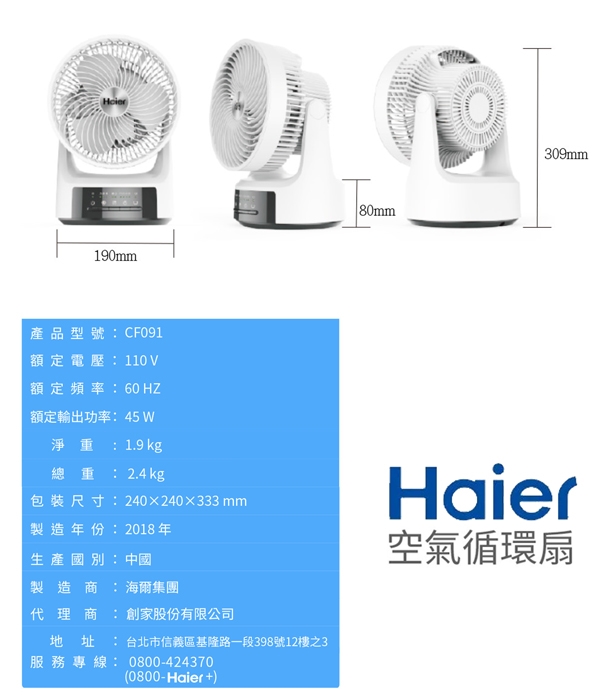 商品規格 商品名稱 : Haier 海爾 風力集中空氣柱 9吋 360度旋轉 對流氣流循環扇 品牌 : 無 型號 : CF091 型式 : 空氣循環扇 風段 : 3段以上 風扇葉數 : 3片式 風扇尺寸 : 9吋 產品尺寸 : 約 22 x 22 x 32 CM 顏色 : 白色系 重量 : 1.9 kg 消耗電功率(W) : 45W 保固 : 1年 體驗說明 使用方法說明 無 注意事項 保固:一年保固 (非人為因素損壞)