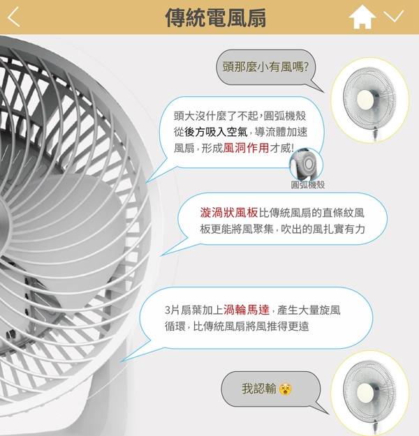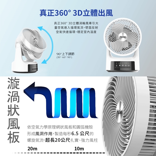 3D立體渦輪出風 空氣力學導入氣流循環 四段調整90度擺頭 送風無死角 靜音舒適簡潔優雅又小巧 增加冷房效果 商品名稱 Haier海爾風力集中空氣柱9吋360度旋轉對流氣流循環扇 售價:2490