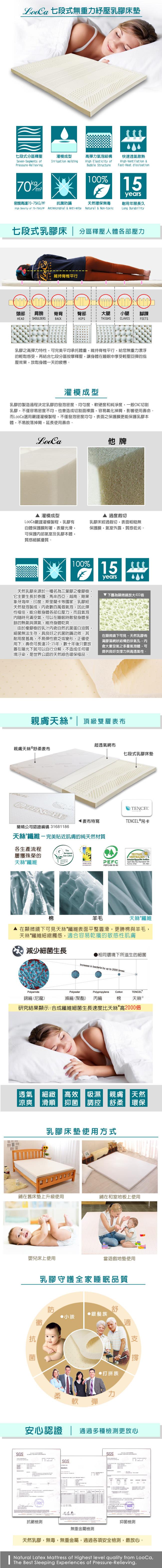 七段式分區 釋壓效果UP 通過國家級SGS檢測 天然抑菌環保無毒 高密度灌模成型 全家安心睡眠首選 品牌 LooCa規格 雙人加大6尺類型 乳膠床墊參考軟硬度 偏軟尺寸 公分 雙人 售價:8488