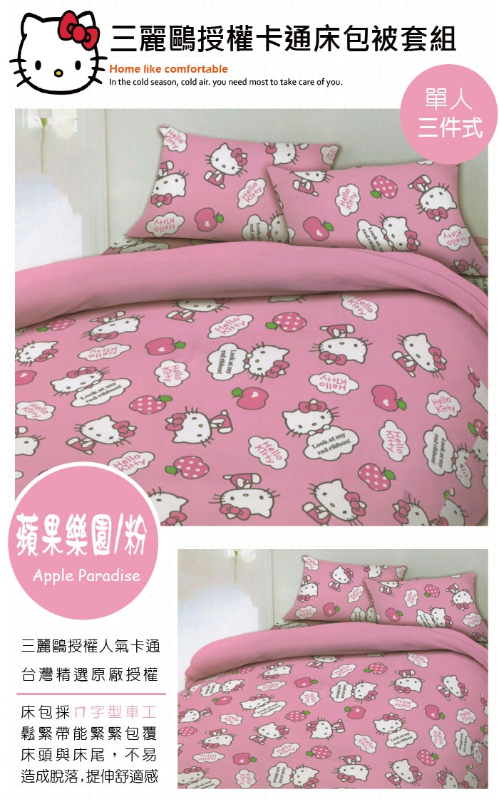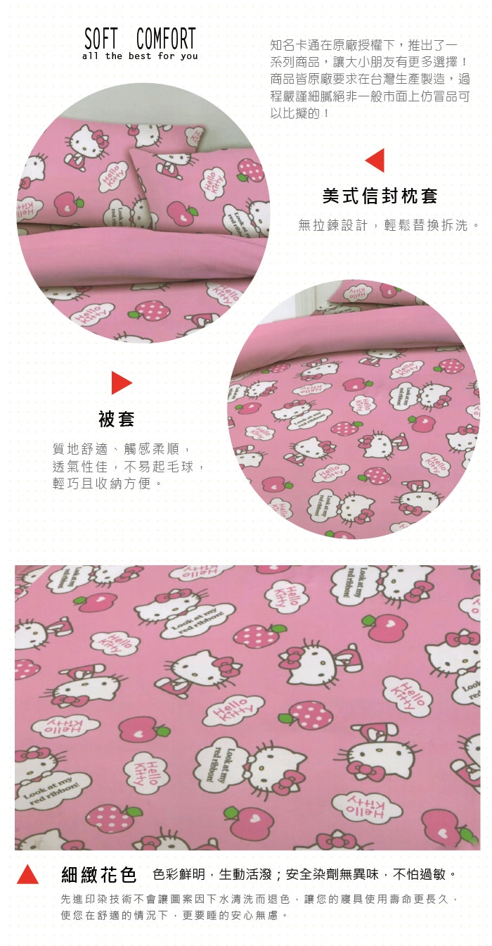 全程台灣精製 值得信賴 色彩鮮明 安全染劑無異味 不過敏 生動活潑 三麗鷗授權 使用放心 可愛滿分 品牌 HOKANG種類 床包類型 被套床包組規格 單人3 5尺功能 透氣流行元 售價:1698